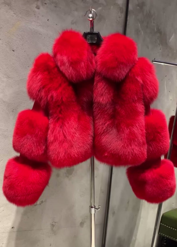 Crafted from authentic fox fur with a refined turn-down collar, this jacket exemplifies timeless elegance. The pristine pelt is complemented by a smooth polyester lining, ensuring both luxury and practicality. A statement piece for the discerning wardrobe.