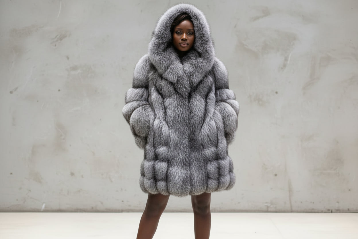 Elevate your winter wardrobe with this exquisite hooded fox fur coat, crafted from genuine fur in a refined 3/4 length silhouette. The luxurious drape and sophisticated hood detail create an effortlessly chic aesthetic for the discerning wearer. Perfect as a standalone investment piece or as a coordinated couples' ensemble for those seeking coordinated elegance.