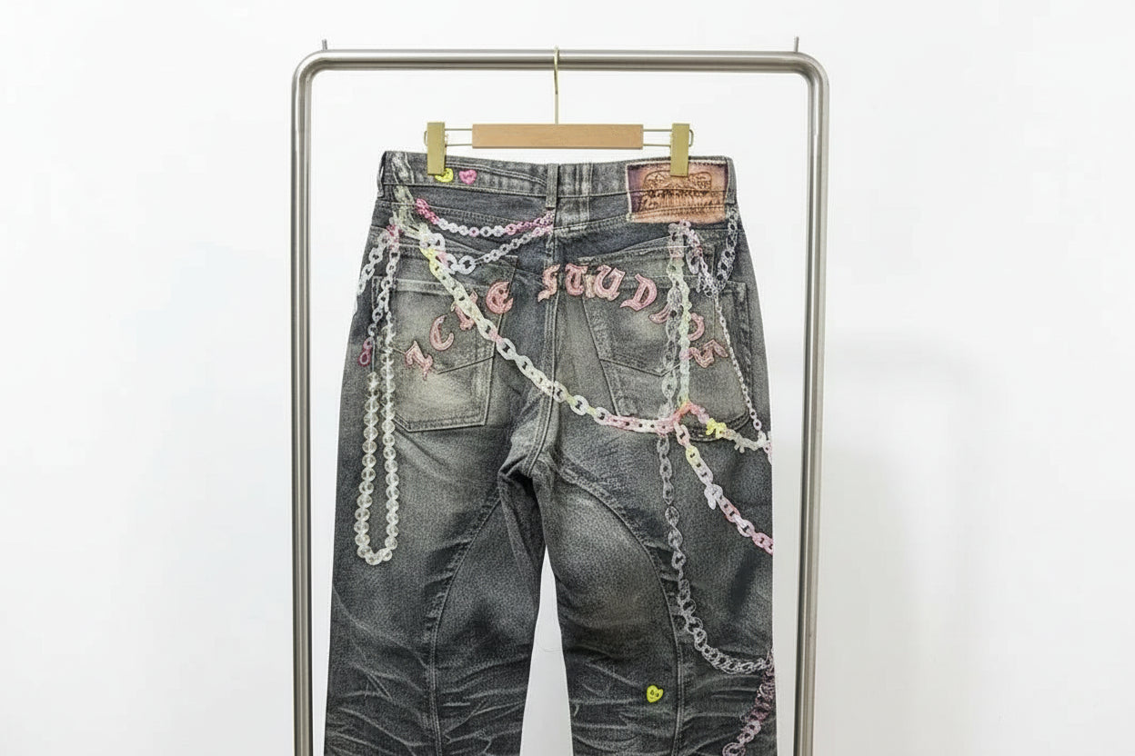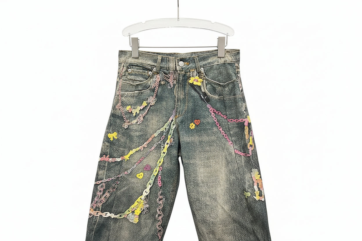 Elevate your denim game with She Locked In jeans—a niche design featuring striking chain prints and contrast colors. These high-waist, loose-fit ankle-length jeans blend vintage charm with modern edge, perfect for effortless high-street style. Crafted from lightweight polyester denim with a crisp light wash, they're versatile enough for any season. The classic zipper fly and relaxed silhouette make them a go-to piece for casual wear that turns heads.